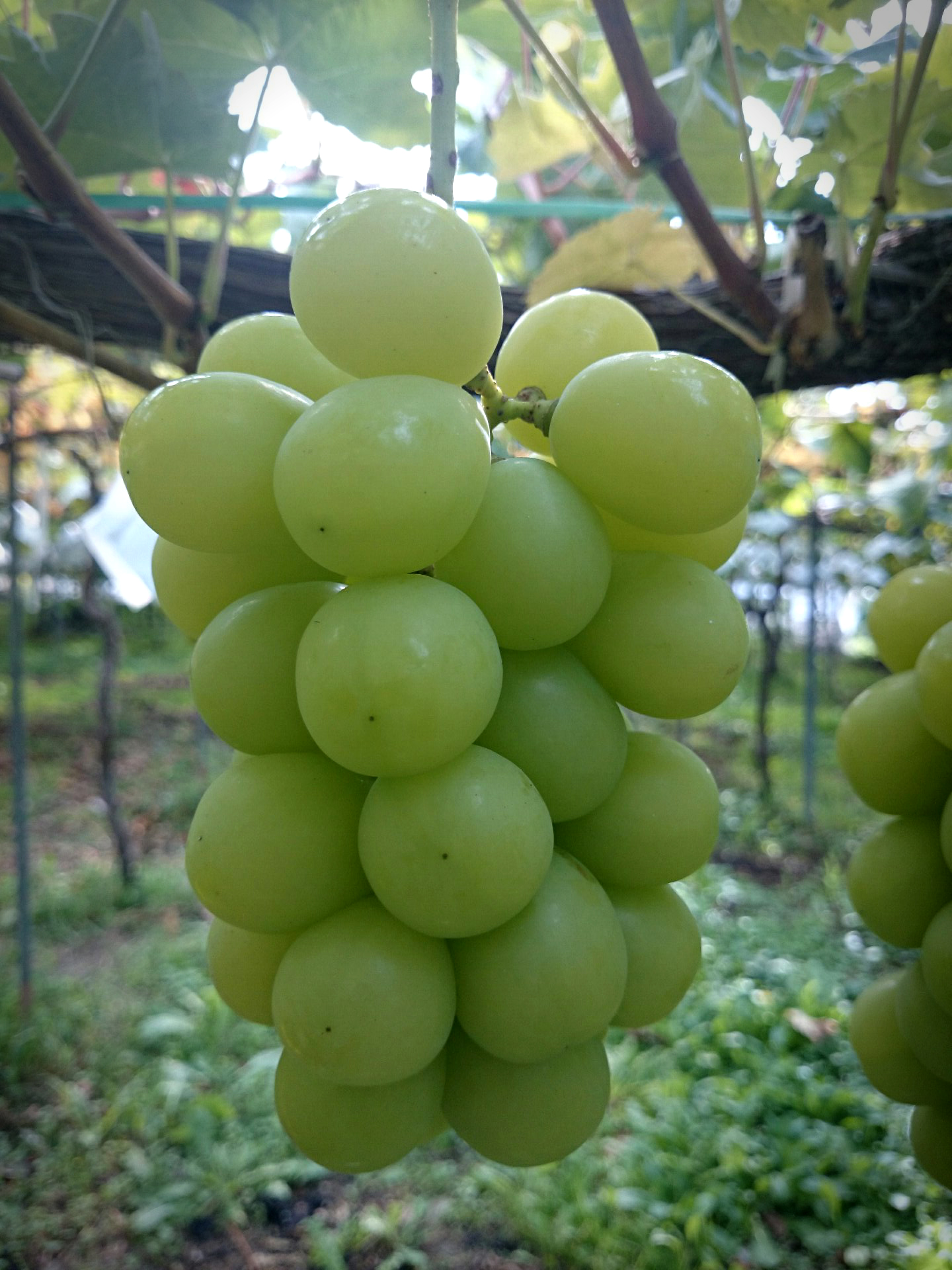 ブドウ シャインマスカット 【特性】 ・種無し ・皮ごと食べられます。 甘み ★★★★☆ 酸味 ★★☆☆☆ 香り ★★★☆☆ 保存 ★★★★★ 冷蔵庫で10日程度 大粒でマスカットの香りが強く、糖度が20度前後と高くて酸味は少ないのが特徴です。果肉がしまっていてシャキシャキした食感もおいしく、人気急上昇中のぶどうです。